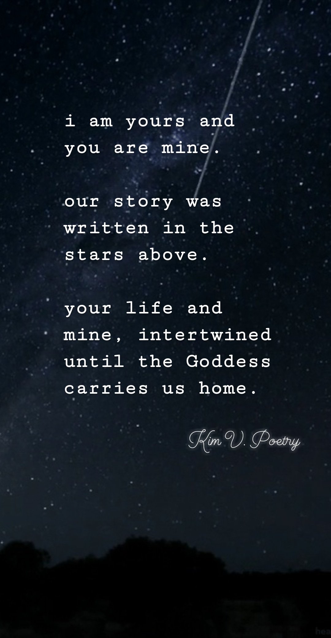 I am yours and you are mine. Our story was written in the stars above. Your life and mine, intertwined until the Goddess carries us home. Kim V. Poetry
