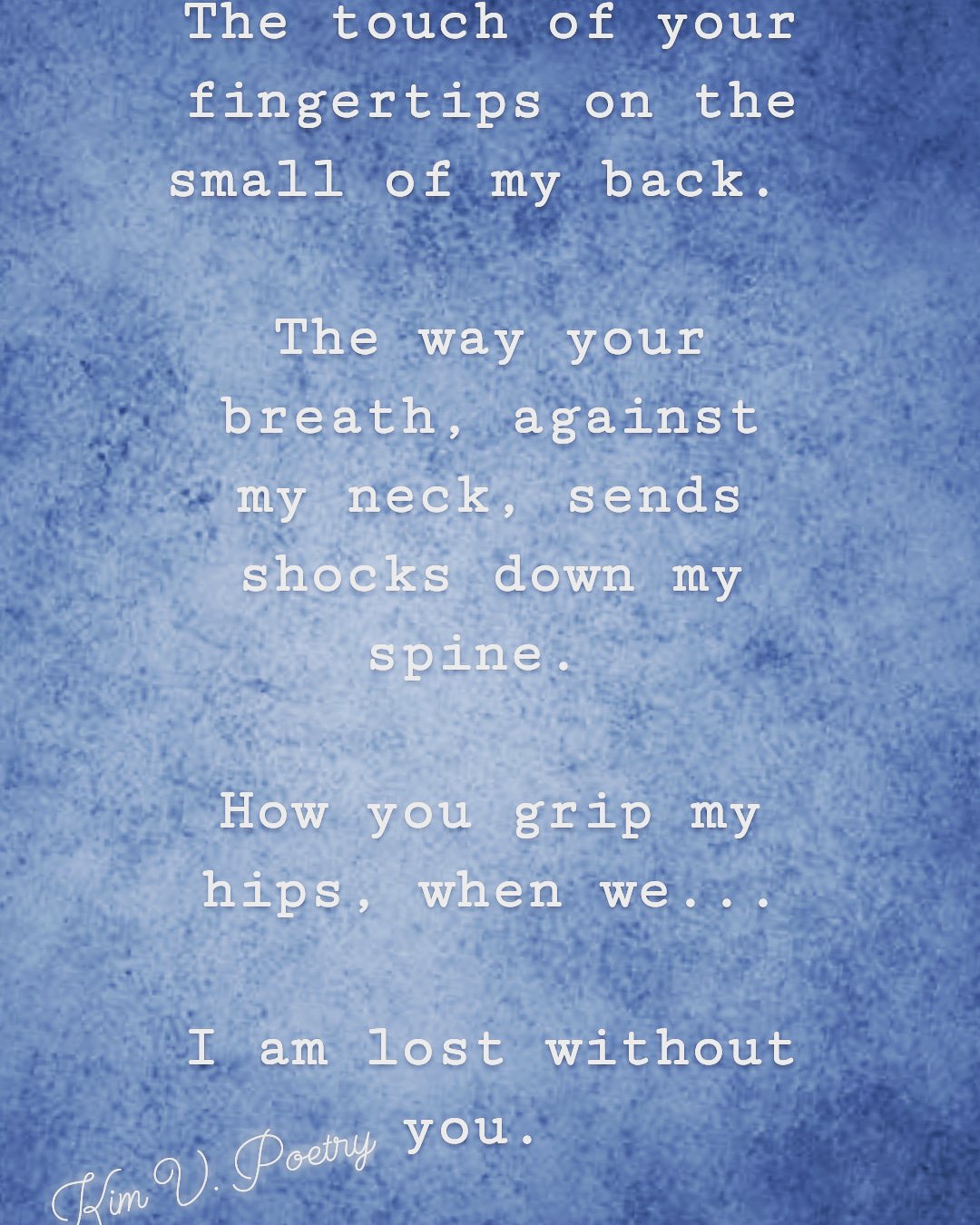 I am lost without you. The touch of your fingertips on the small of my back. The way your breath, against my neck, sends shocks down my spine. How you grip my hips, when we… I am lost without you.