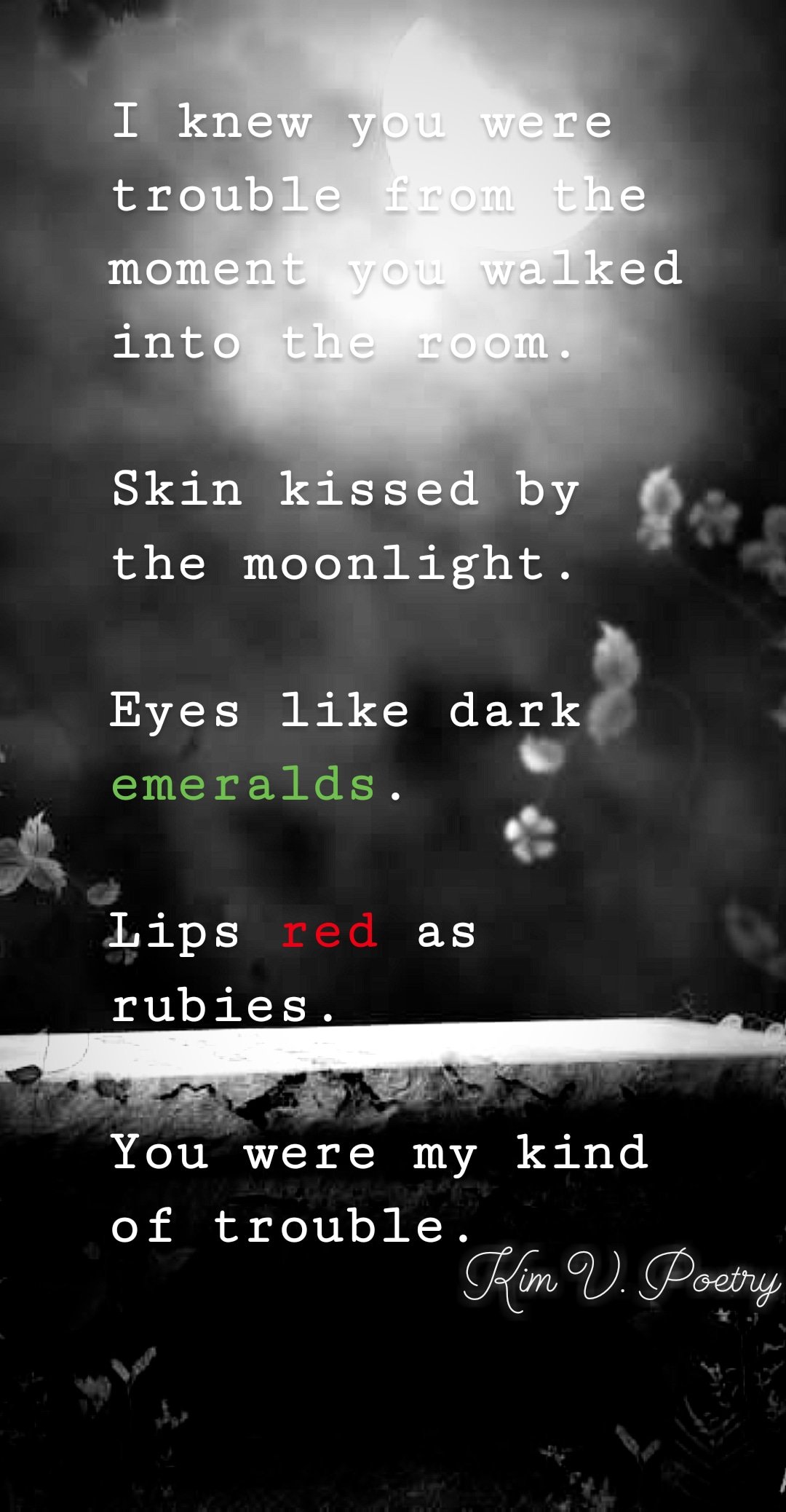 I knew you were trouble from the moment you walked into the room. Skin kissed by the moonlight. Eyes like dark emeralds. Lips red as rubies. You were my kind of trouble.