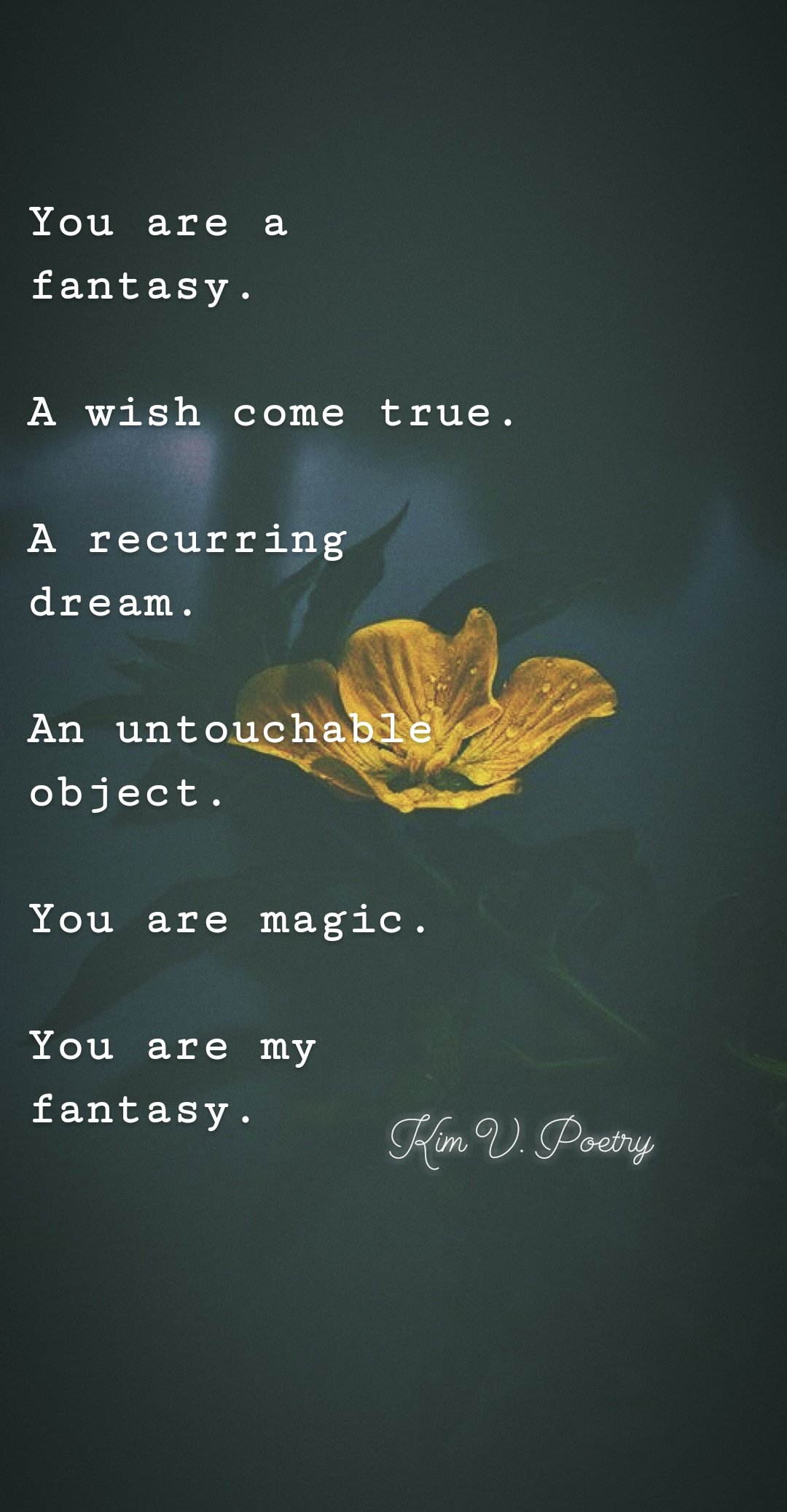 You are a fantasy. A wish come true. A recurring dream. An untouchable object. You are magic. You are my fantasy.✍🏽Kim V. Poetry