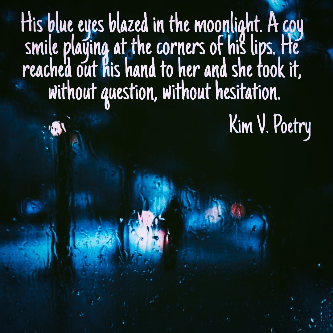 His blue eyes blazed against the moonlight. His dark curls unfurling under the weight of the heavy rain. A coy smile playing at the corners of his lips. He reached out his hand to her and she took it, without question, without hesitation.