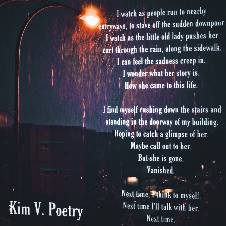 I watch as the little old lady pushes her cart through the rain, along the sidewalk.