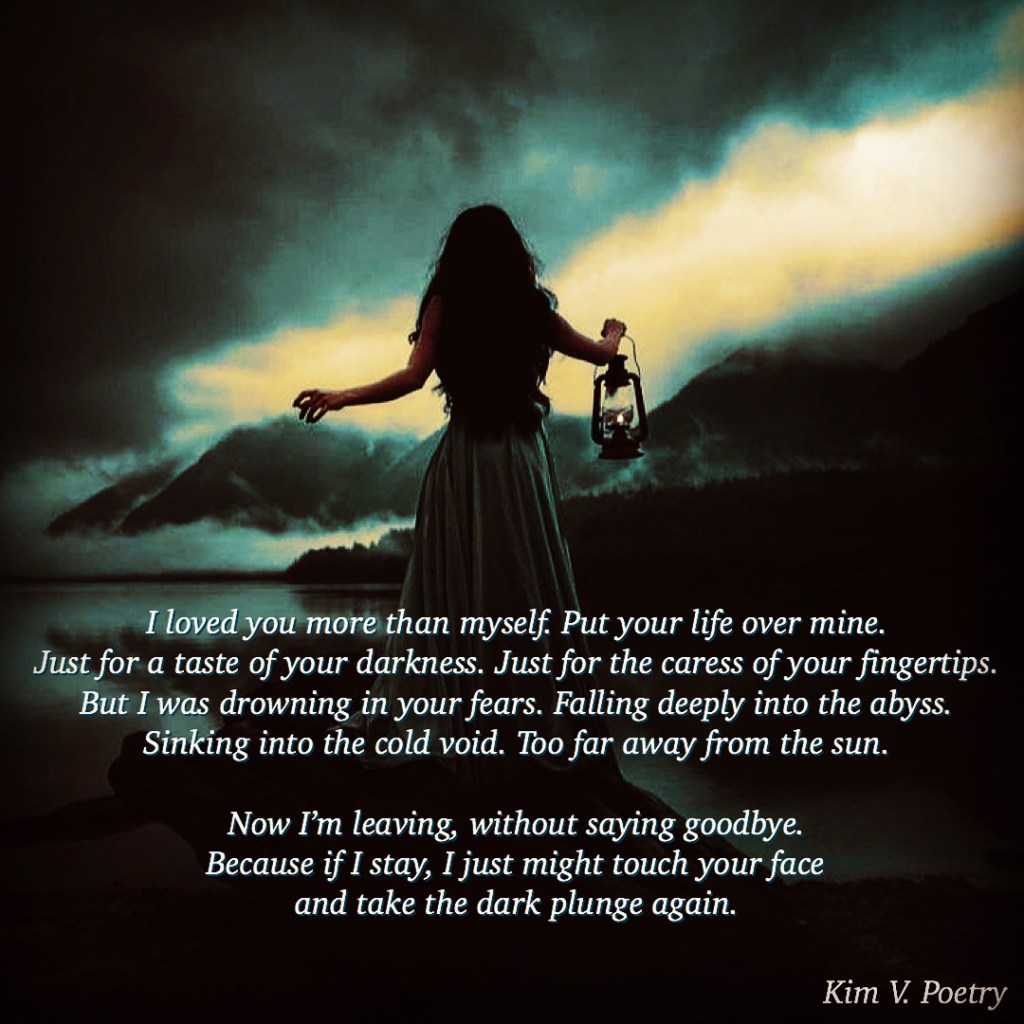 Now I’m leaving, without saying goodbye. Because if I stay, I just might touch your face and take the dark plunge again.