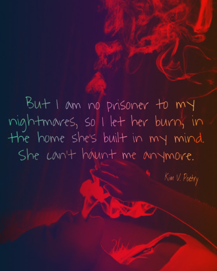 I almost fall back into her arms, cocooning myself in my failures. But I am no prisoner to my nightmares, so I let her burn, in the home she’s built in my mind. She can’t haunt me anymore.