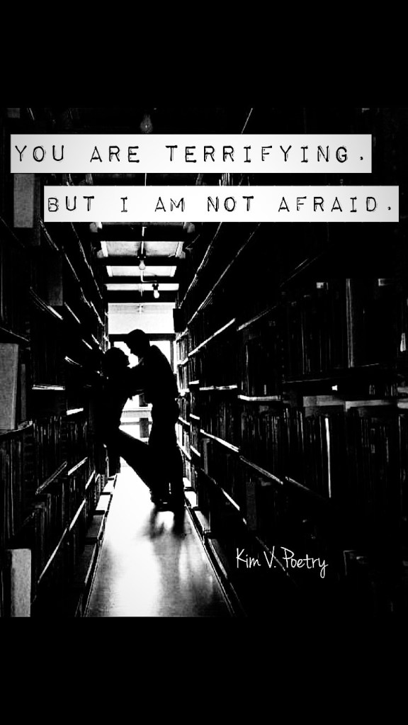 You are terrifying.But I am not afraid. You are dangerous.Honeyed words and deft fingers.But I’m not afraid. You are toxic and tortured.Come with me.I’ll make you feel safe.I’ll take care of you. I’ll never be afraid of you. Kim V. Poetry